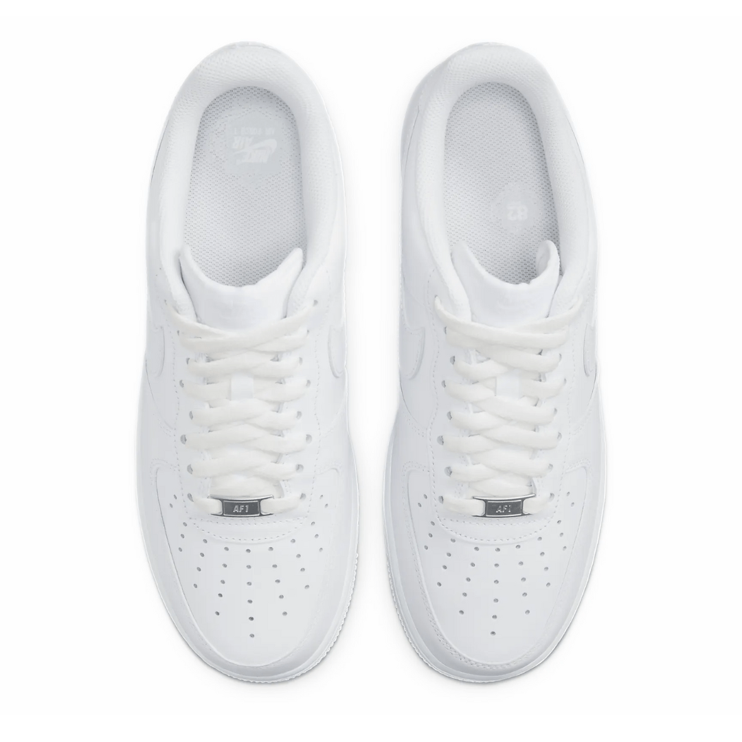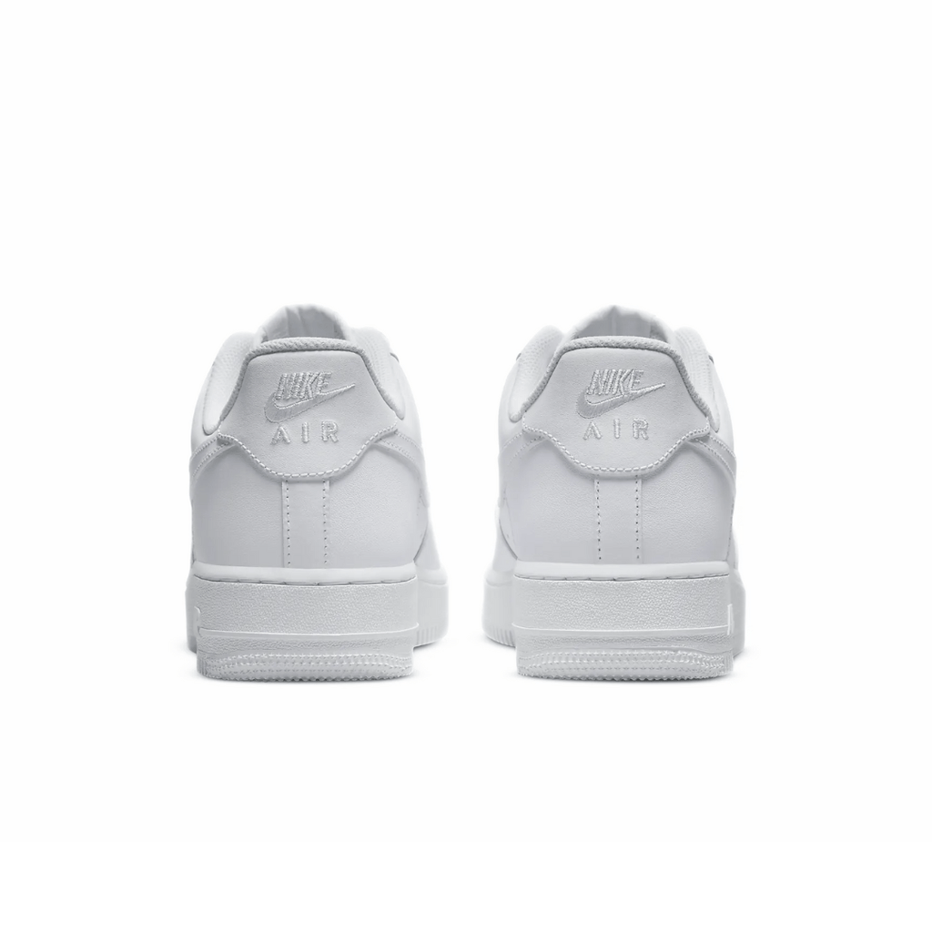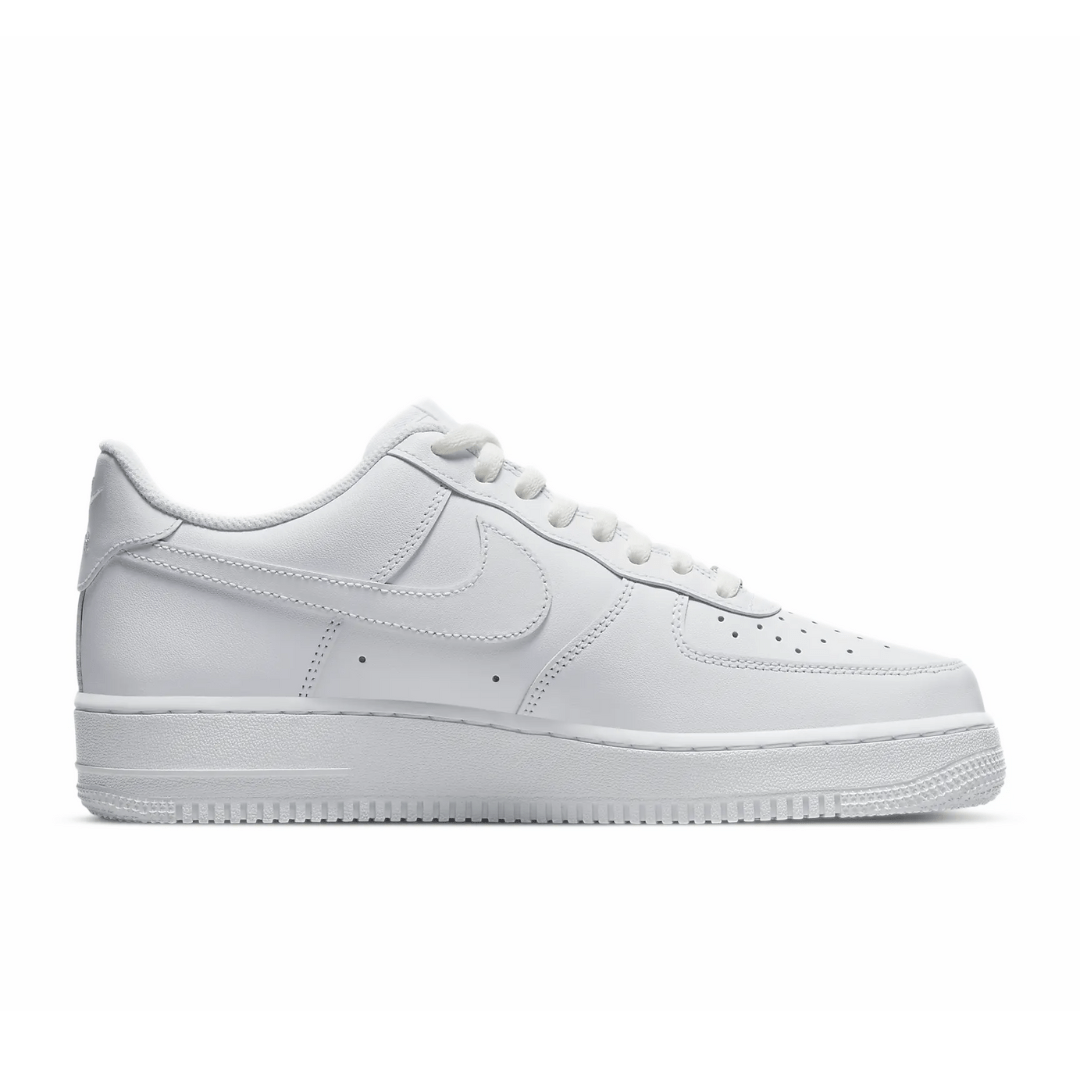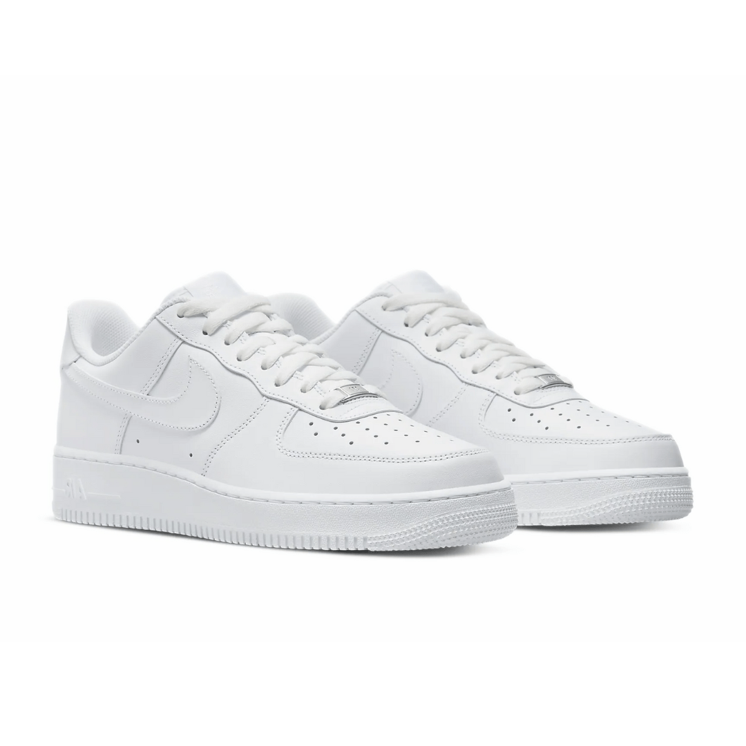 The Nike Air Force 1 Low White ‘07 features an all-white leather upper with a perforated toe box and Swoosh overlays. A Nike heel embroidery and white sole completes the design.